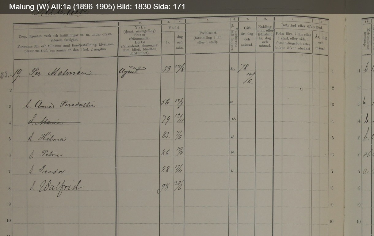 Per Malmén<br>Födelse: 12 aug 1853<br>Hemvist: Mellan 1906 och 1916 - Idbäck, Malung, Kopparbergs, Dalarna, Sweden<br>Vigsel: 10 jun 1878<br>Maka: Anna Persdotter<br>Barn: Hilma, Petrus, Teodor, Valfrid, Petrus Malmén<br>Bok: LandSwedenBokMalung AII 2a, 1906 - 1916 ProvinsDalarnaPlatsIdbäck LänKopparbergsSida181 FörsamlingMalungRad1 Se hushållsmedlemmar<br><a id='household'></a>Hushåll<br>Relation till huvudfigur; Namn; Födelse; Föreslagna alternativ<br>Överhuvud; <a href="https://www.myheritage.se/research/collection-10180/svenska-husforhorslangder-1840-1947?s=321833041&itemId=17563698-&groupId=1b702008d32ee37a132ede60b8e94823&action=showRecord&recordTitle=Per+Malm%C3%A9n">Per Malmén</a>; 12 aug 1853; <br>Fru; <a href="https://www.myheritage.se/research/collection-10180/svenska-husforhorslangder-1840-1947?s=321833041&itemId=17563699-&groupId=1b702008d32ee37a132ede60b8e94823&action=showRecord&recordTitle=Anna+Persdotter">Anna Persdotter</a>; 14jul 1856; <br>Dotter; <a href="https://www.myheritage.se/research/collection-10180/svenska-husforhorslangder-1840-1947?s=321833041&itemId=17563700-&groupId=1b702008d32ee37a132ede60b8e94823&action=showRecord&recordTitle=Hilma">Hilma</a>; 7 jun 1883; <br>Son; <a href="https://www.myheritage.se/research/collection-10180/svenska-husforhorslangder-1840-1947?s=321833041&itemId=17563701-&groupId=1b702008d32ee37a132ede60b8e94823&action=showRecord&recordTitle=Petrus">Petrus</a>; 14 apr 1886; <br>Son; <a href="https://www.myheritage.se/research/collection-10180/svenska-husforhorslangder-1840-1947?s=321833041&itemId=17563702-&groupId=1b702008d32ee37a132ede60b8e94823&action=showRecord&recordTitle=Teodor">Teodor</a>; 17 nov 1888; <br>Son; <a href="https://www.myheritage.se/research/collection-10180/svenska-husforhorslangder-1840-1947?s=321833041&itemId=17563703-&groupId=1b702008d32ee37a132ede60b8e94823&action=showRecord&recordTitle=Valfrid">Valfrid</a>; 30 jun 1898; <br>Son; <a href="https://www.myheritage.se/research/collection-10180/svenska-husforhorslangder-1840-1947?s=321833041&itemId=17563704-&groupId=1b702008d32ee37a132ede60b8e94823&action=showRecord&recordTitle=Petrus+Malm%C3%A9n">Petrus Malmén</a>; 17 nov 1886;