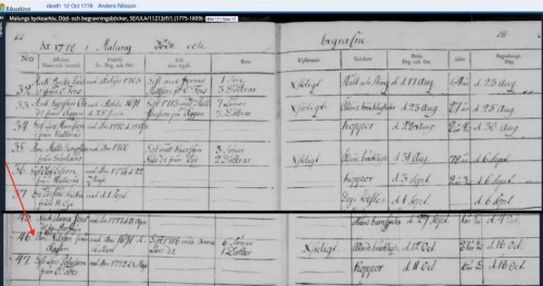 | Dödsdatum | 1778/10/12 (Yttermalung, Malung, Kopparbergs län) |